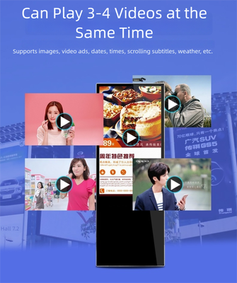 This energy-efficient 55-inch digital signage features a stable floor-standing base and wireless synchronization capabilities, designed for maximum visibility and cost-effective operation in various commercial environments.